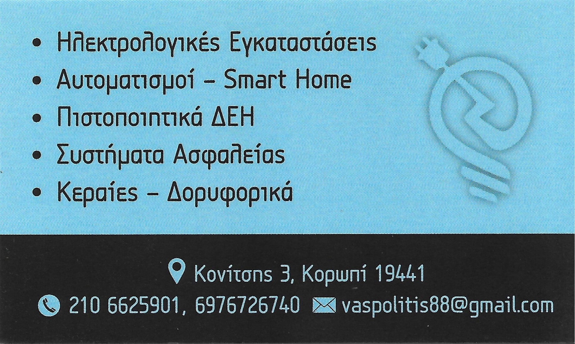 ΠΟΛΙΤΗΣ ΒΑΣΙΛΕΙΟΣ ΗΛΕΚΤΡΙΚΕΣ ΗΛΕΚΤΡΟΛΟΓΙΚΕΣ ΕΓΚΑΤΑΣΤΑΣΕΙΣ ΚΟΡΩΠΙ, ΗΛΕΚΤΡΟΛΟΓΟΣ ΣΤΟ ΚΟΡΩΠΙ, ΗΛΕΚΤΡΟΛΟΓΟΙ ΣΤΟ ΚΟΡΩΠΙ, ΗΛΕΚΤΡΙΚΕΣ ΕΓΚΑΤΑΣΤΑΣΕΙΣ ΣΤΟ ΚΟΡΩΠΙ, ΑΝΑΚΑΙΝΙΣΕΙΣ ΟΙΚΙΩΝ ΣΤΟ ΚΟΡΩΠΙ, ΕΠΑΓΓΕΛΜΑΤΙΚΩΝ ΧΩΡΩΝ ΣΤΟ ΚΟΡΩΠΙ, ΠΙΣΤΟΠΟΙΗΤΙΚΑ ΔΕΗ ΣΤΟ ΚΟΡΩΠΙ, ΕΓΚΑΤΑΣΤΑΣΕΙΣ - ΜΕΛΕΤΕΣ ΦΩΤΙΣΜΟΥ ΣΤΟ ΚΟΡΩΠΙ, ΑΥΤΟΜΑΤΙΣΜΟΙ (SMART HOME) ΣΤΟ ΚΟΡΩΠΙ, ΣΥΣΤΗΜΑΤΑ ΑΣΦΑΛΕΙΑΣ ΣΤΟ ΚΟΡΩΠΙ, ΚΑΜΕΡΕΣ ΣΤΟ ΚΟΡΩΠΙ, ΣΥΝΑΓΕΡΜΟΙ ΣΤΟ ΚΟΡΩΠΙ, ΤΟΠΟΘΕΤΗΣΕΙΣ ΚΕΝΤΡΙΚΩΝ ΚΕΡΑΙΩΝ ΣΤΟ ΚΟΡΩΠΙ, ΔΟΡΥΦΟΡΙΚΩΝ ΣΥΣΤΗΜΑΤΩΝ ΣΤΟ ΚΟΡΩΠΙ, ΚΟΡΩΠΙ