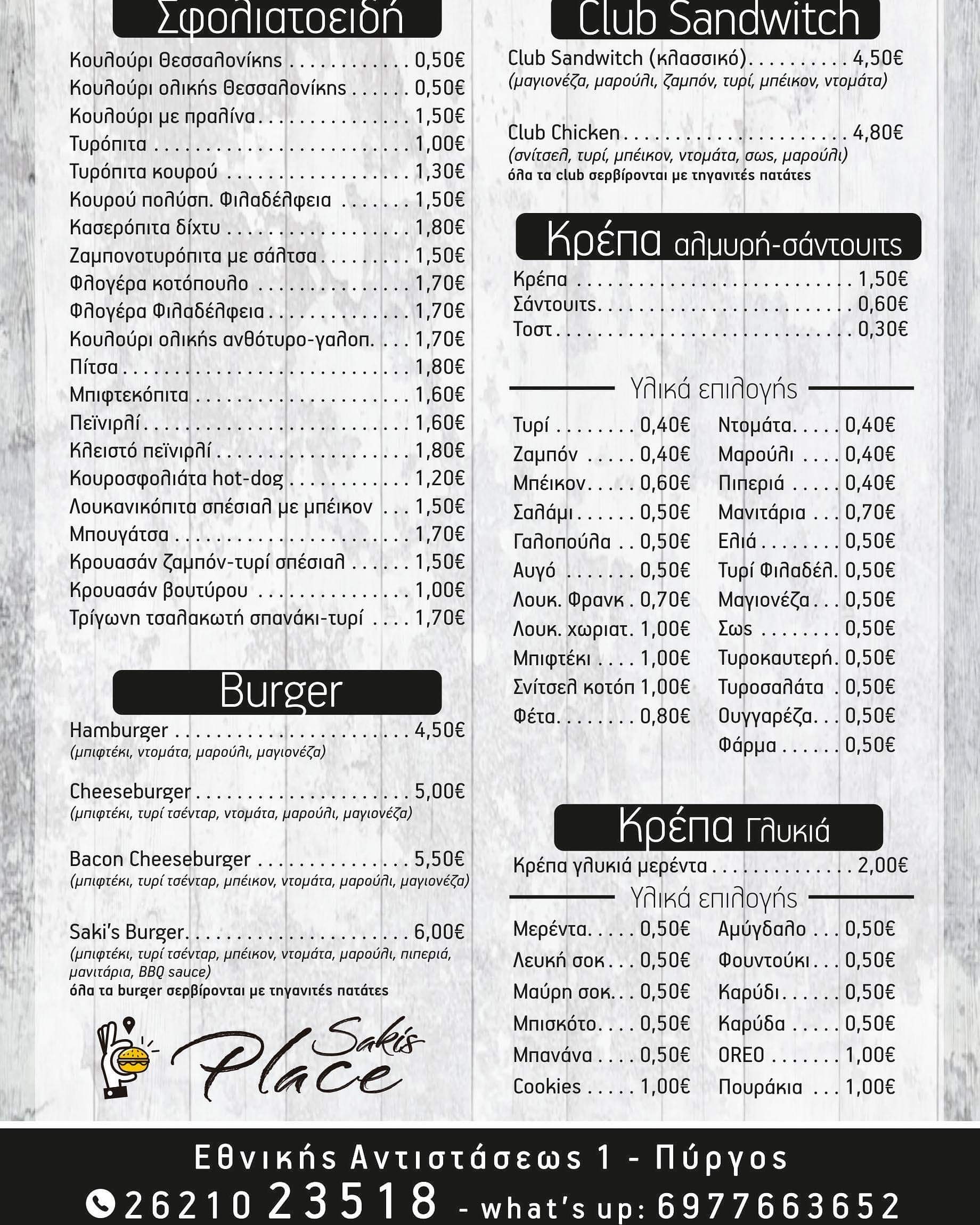 SAKIS PLACE Pyrgos, CREPERIE Pyrgos, CREPE Pyrgos, SANDWICH Pyrgos, SFOLIATES Pyrgos, BURGER Pyrgos, CREPE SWEET Pyrgos, crêpes salées Pyrgos, CLUB SANDWICH Pyrgos, JUICE Pyrgos, JUS NATUREL ILIA Pyrgos, FRESH JUICE ILIA Pyrgos, CAFÉ ESPAGNOL Pyrgos, LIVRAISON ILIA Pyrgos