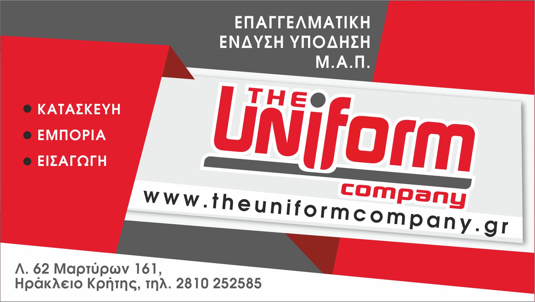 Η εταιρεία THE UNIFORM COMPANY δραστηριοποιείται στην παραγωγή, λιανική και χονδρική πώληση στολών προστασίας & εργασίας, από το 2005 έως και σήμερα, με έδρα το Ηράκλειο Κρήτης. Όλα αυτά τα χρόνια συνεργαζόμαστε επιτυχώς με μεγάλους οίκους της παγκόσμιας αγοράς που αφορούν την επαγγελματική ένδυση και υπόδηση και τα Μέσα Ατομικής Προστασίας. Ενδεικτικά, αναφέρουμε: Portwest, Delta Plus, Sol's, Croc's, SFC, Suecos, Base κ.ά. Ψάχνουμε για εσάς τους ειδικούς στο σχεδιασμό καινοτομιών στο χώρο της προστασίας των εργαζομένων και συνεργαζόμαστε μόνο μ' εκείνους που χρησιμοποιούν άριστα υλικά και υψηλή τεχνολογία. Με την πάροδο των ετών, συνειδητοποιήσαμε πως υπήρχε η ανάγκη για ειδικές κατασκευές, προσαρμοσμένες στην ιδιαιτερότητα της εργασίας του κάθε πελάτη μας, οπότε κι αναπτυχθήκαμε και σ' αυτόν τον τομέα, στήνοντας δική μας βιοτεχνία κατασκευής ενδυμάτων και συνεργαζόμενοι με βιοτεχνικές εταιρείες φασόν σε Ελλάδα κι εξωτερικό, καταφέραμε ν' ανταποκριθούμε στην κάθε ανάγκη που προκύπτει για μία ειδική κατασκευή, η οποία καλύπτει τις προδιαγραφές που ο πελάτης μάς ορίζει. Σκοπός μας είναι να παρέχουμε πιστοποιημένα προϊόντα στους πελάτες μας, σύμφωνα με τους κανόνες που θέτει κάθε φορά η Ευρωπαϊκή Ένωση, στις ανταγωνιστικότερες τιμές της αγοράς. Επιθυμία μας είναι η ανάγκη σας για προστασία κι ομοιομορφία στην εργασία σας να αποτελεί ευχαρίστηση κι όχι εξαναγκασμό. Επιπλέον παροχές: Διαθέτουμε βιοτεχνία παραγωγής ενδυμάτων, εργαστήριο εκτυπώσεων, κεντητική μηχανή και γραφιστικό τμήμα για την λογοτύπηση των προϊόντων μας. Πελάτες μας είναι: Ξενοδοχειακές μονάδες, Εστιατόρια - Καφέ, Εργαστήρια τροφίμων, Κατασκευαστικές εταιρίες, Αεροπορικές εταιρίες, Ιατρεία και Ινστιτούτα Αισθητικής. Παράλληλα, δραστηριοποιούμαστε στην πώληση επιχειρηματικού δώρου, όπως: Στυλό, Αναπτήρες, Μπρελόκ, Αντζέντες, Ημερολόγια, Μπλουζάκια, Καπέλα και άλλα συναφή προϊόντα, έτσι, ώστε να παρέχουμε ολοκληρωμένες λύσεις στους πελάτες μας. Στο κατάστημά μας θα βρείτε μεγάλη γκάμα ετοιμοπαράδοτων προϊόντων, καθώς και εξειδικευμένο προσωπικό για τη σωστή σας εξυπηρέτηση.