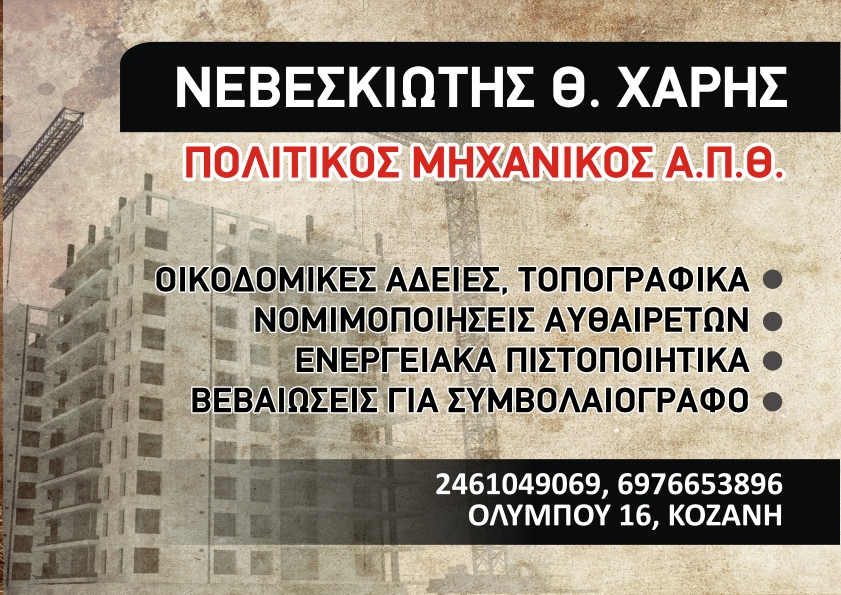 ΠΟΛΙΤΙΚΟΣ ΜΗΧΑΝΙΚΟΣ ΣΤΗΝ ΚΟΖΑΝΗ,ΤΕΧΝΙΚΟ ΓΡΑΦΕΙΟ ΣΤΗΝ ΚΟΖΑΝΗ ΚΑΙ ΤΟ ΝΟΜΟ ΚΟΖΑΝΗΣ,ΟΙΚΟΔΟΜΙΚΕΣ ΑΔΕΙΕΣ, ΜΕΛΕΤΕΣ-ΕΠΙΒΛΕΨΕΙΣ ΕΡΓΩΝ, ΤΟΠΟΓΡΑΦΙΚΑ, ΤΑΚΤΟΠΟΙΗΣΗ ΑΥΘΑΙΡΕΤΩΝ, ΝΟΜΙΜΟΠΟΙΗΣΕΙΣ, ΕΝΕΡΓΕΙΑΚΑ ΠΙΣΤΟΠΟΙΗΤΙΚΑ, ΕΞΟΙΚΟΝΟΜΩ ΚΑΤΟΙΚΟΝ, ΒΕΒΑΙΩΣΕΙΣ ΓΙΑ ΣΥΜΒΟΛΑΙΟΓΡΑΦΟ