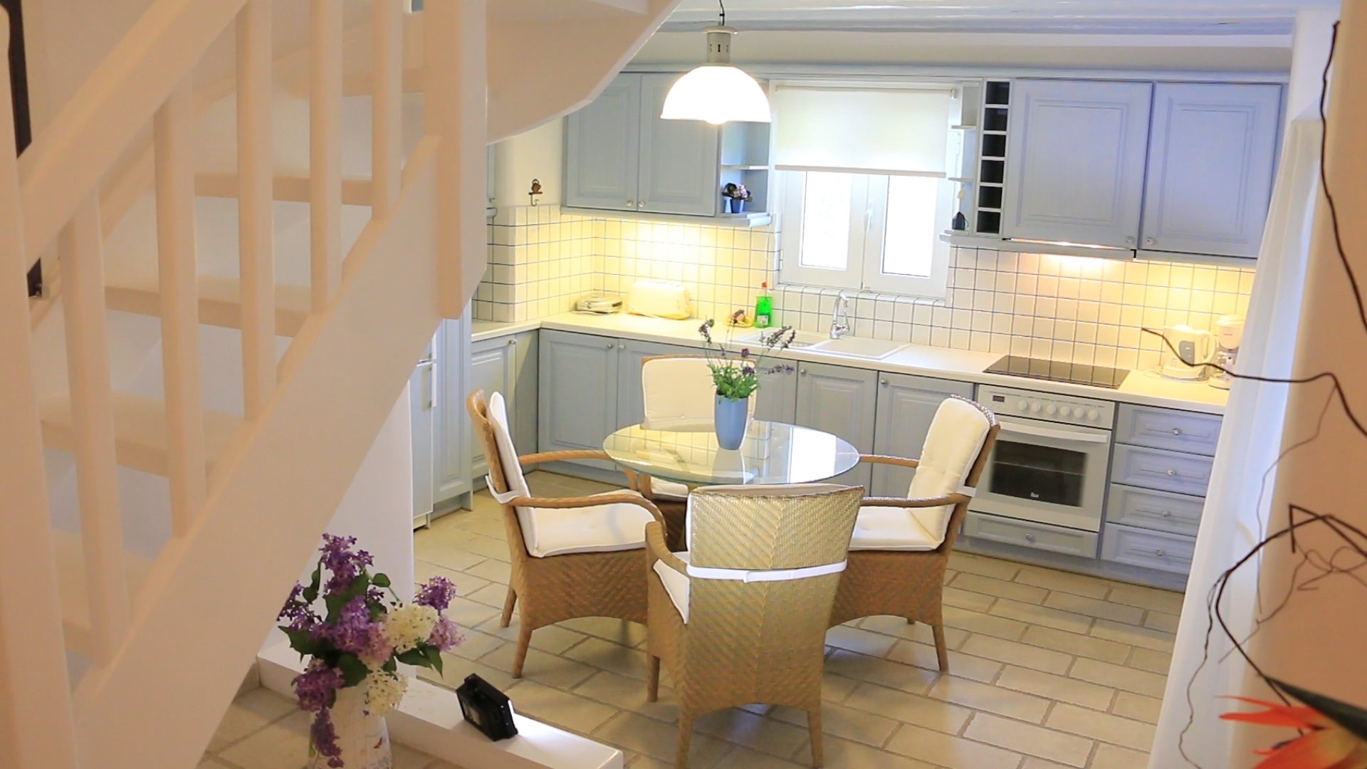 Εξοπλισμένα με κρεβάτια από σφυρήλατο σίδερο και λευκό-μπλε τόνο, τα δωμάτια και τα διαμερίσματα έχουν θέα στο Αιγαίο Πέλαγος, τον κήπο ή την πισίνα. Όλες οι κλιματιζόμενες μονάδες είναι εξοπλισμένες με τηλεόραση επίπεδης οθόνης, μίνι μπαρ, ψυγείο και πολλά άλλα, ενώ μερικά περιλαμβάνουν επίσης πλήρως εξοπλισμένη κουζίνα. Ένα καθιστικό με τζάκι υπάρχει επίσης σε ορισμένες μονάδες.