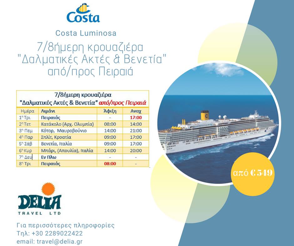 Τo DELIA LTD συνεργάζεται με τις εταιρίες κρουαζιέρας που προσεγγίζουν την Μύκονο και παρέχει τις καλύτερες υπηρεσίες σε θέματα γραφειοκρατικών διαδικασιών ελέγχου κατά την άφιξη και αναχώρηση στα λιμάνια της Μυκόνου.