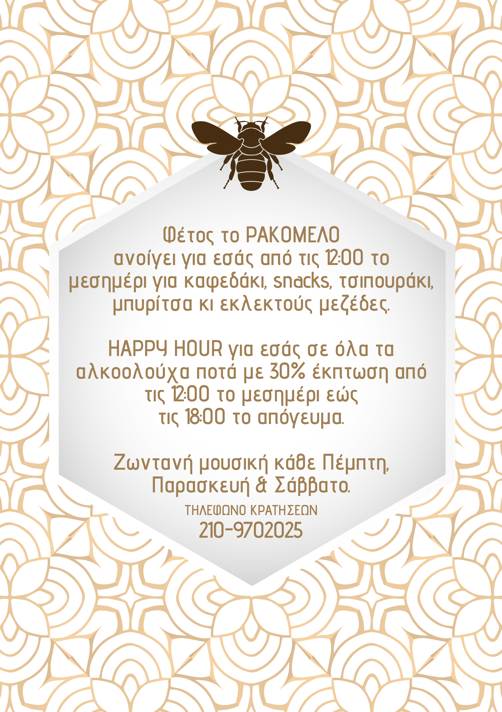 Το Ρακόμελο γεννήθηκε στην Ηλιούπολη, σε μια πέτρινη μονοκατοικία του `29, το Δεκέμβρη του 2006. Πολύχρωμο και αρωματικό καλλιτεχνικό στέκι, χωρητικότητας 50-60 ατόμων, που αγαπάει τα παραδοσιακά αποστάγματα, τη fusion ελληνική κουζίνα με βάση το ρακόμελο, την ελληνική και παγκόσμια ποιοτική μουσική και φυσικά τις τέχνες. Διοργανώνει εκθέσεις ζωγραφικής, γλυπτικής, φωτογραφίας, κοσμημάτων, μικρές θεατρικές παραστάσεις. Kάθε Πέμπτη φιλοξενεί ζωντανά ο @Nikos Giolias Music is our lives... Dj`s Antonis Mavrogiannis (Fr.) Resident DJ (www.trippin.gr) Petros Xalas (Sat.) ο ξεχωριστός μας http://peterocool.listen2myradio.com/ Paceko Varius Collections (rest of the week) Τα Σαββατοκύριακα το πρωί διοργανώνουμε σεμινάρια και bazaar! HAPPY HOUR | μόνιμα πια καθημερινά κι όλες τις ώρες! ΤΑ 100ml στο δικό μας ΡΑΚΟΜΕΛΟ μόνο 4€! INFO In this page you can see fotos/videos/prev.- coming events/news Athens Voice (athens voice spot) distomou 9 , ilioupoli | t: 2109702025 | www.torakomelo.gr http://www.facebook.com/groups/torakomelo/ https://www.facebook.com/pages/Rakomelo/105461116188171 free Wifi Spot Το Ρακόμελο γεννήθηκε στην Ηλιούπολη, σε μια πέτρινη μονοκατοικία του `29, το Δεκέμβρη του 2006. Πολύχρωμο και αρωματικό καλλιτεχνικό στέκι, χωρητικότητας 50-60 ατόμων, που αγαπάει τα παραδοσιακά αποστάγματα, τη fusion ελληνική κουζίνα με βάση το ρακόμελο, την ελληνική και παγκόσμια ποιοτική μουσική και φυσικά τις τέχνες. Διοργανώνει εκθέσεις ζωγραφικής, γλυπτικής, φωτογραφίας, κοσμημάτων, μικρές θεατρικές παραστάσεις. Kάθε Πέμπτη φιλοξενεί ζωντανά ο @Nikos Giolias Music is our lives... Dj`s Antonis Mavrogiannis (Fr.) Resident DJ (www.trippin.gr) Petros Xalas (Sat.) ο ξεχωριστός μας http://peterocool.listen2myradio.com/ Paceko Varius Collections (rest of the week) Τα Σαββατοκύριακα το πρωί διοργανώνουμε σεμινάρια και bazaar! HAPPY HOUR | μόνιμα πια καθημερινά κι όλες τις ώρες! ΤΑ 100ml στο δικό μας ΡΑΚΟΜΕΛΟ μόνο 4€! INFO In this page you can see fotos/videos/prev.- coming events/news Athens Voice (athens voice spot) distomou 9 , ilioupoli | t: 2109702025 | www.torakomelo.gr http://www.facebook.com/groups/torakomelo/ https://www.facebook.com/pages/Rakomelo/105461116188171 free Wifi Spot ΚΑΦΕΤΕΡΙΑ ΣΤΗΝ ΗΛΙΟΥΠΟΛΗ, ΚΑΦΕ ΣΤΗΝ ΗΛΙΟΥΠΟΛΗ, ΜΠΑΡ ΣΤΗΝ ΗΛΙΟΥΠΟΛΗ, ΜΕΖΕΔΟΠΩΛΕΙΟ ΣΤΗΝ ΗΛΙΟΥΠΟΛΗ, ΣΤΟ ΝΟΜΟ ΑΤΤΙΚΗΣ