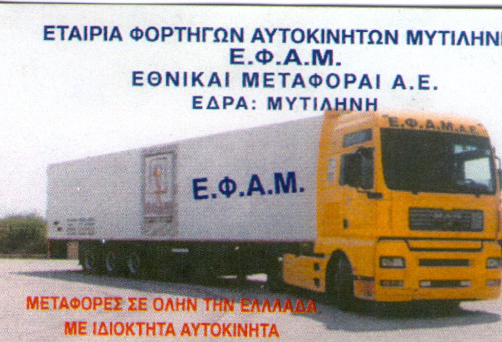 Ξεκινώντας μια προσπάθεια το 1976, η Εταιρεία Φορτηγών Αυτοκινήτων Μυτιλήνης, γνωστή εδώ και δεκαετίες με τον διακριτικό τίτλο ΕΦΑΜ ΑΕ, προσφέρει ποιοτικές υπηρεσίες, σύμφωνα πάντα με τις υψηλότερες προδιαγραφές και την απόλυτη εξυπηρέτηση των αναγκών των πελατών μας.Με το μεγάλο στόλο των οχημάτων της, μπορεί και προσφέρει στον πελάτη, ποιότητα, αξιοπιστία, συνέπεια και ταχύτητα, σε παραλαβές και παραδόσεις φορτίων, σε όλη την Ελληνική Επικράτεια