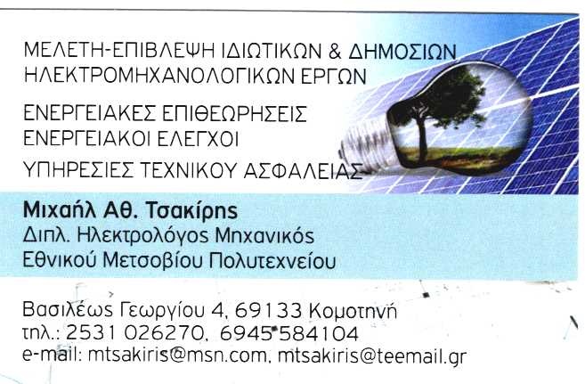 ΜΙΧΑΗΛ ΑΘ. ΤΣΑΚΙΡΗΣ - ΔΙΠΛ. ΗΛΕΚΤΡΟΛΟΓΟΣ ΜΗΧΑΝΙΚΟΣ ΕΜΠ