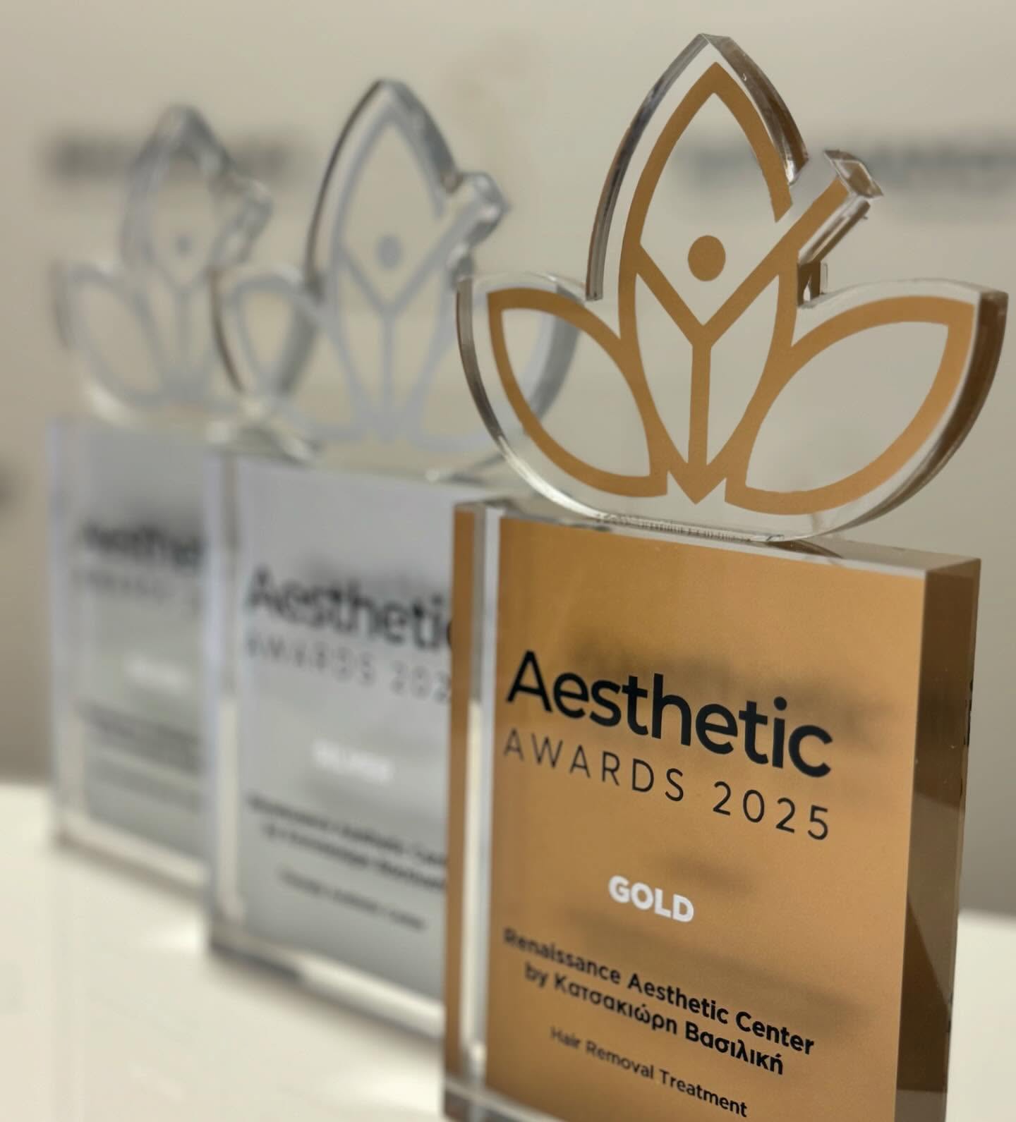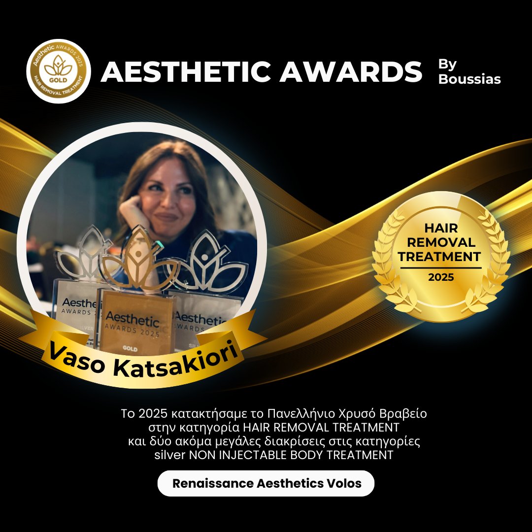 HAIR REMOVAL TREATMENT - 2025 Μετά από χρόνια επιτυχιών στη Θεσσαλία, το Renaissance aesthetics κατέκτησε το Πανελλήνιο Χρυσό Βραβείο στην κατηγορία: Hair Removal treatment, καθώς και SIlver Award στις κατηγορίες NON INJECTABLE BODY TREATMENT και THESSALY AESTHETIC CENTER. Για 5η συνεχόμενη χρονιά βραβευόμαστε για την αποτελεσματικότητα και την αφοσίωσή μας στην αισθητική, την ποιότητα, την καινοτομία και φυσικά την εξέλιξη μας στην τεχνολογία.