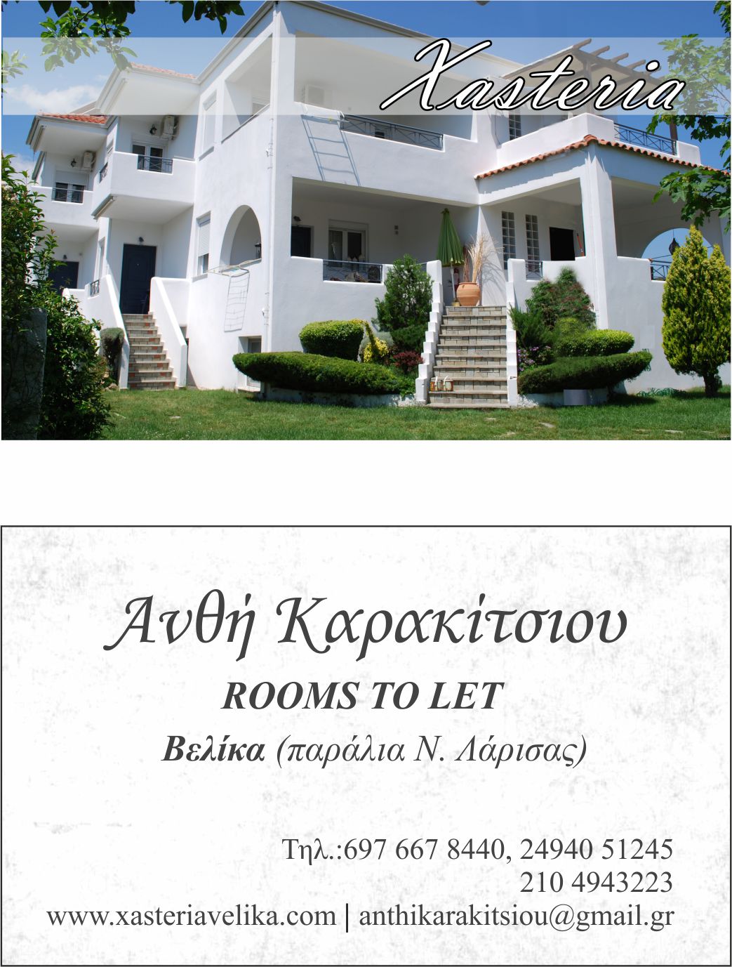 XASTERIA ΕΝΟΙΚΙΑΖΟΜΕΝΑ ΔΩΜΑΤΙΑ ΒΕΛΙΚΑ ΛΑΡΙΣΑ , KARAKITSIOS ROOMS ΕΝΟΙΚΙΑΖΟΜΕΝΑ ΔΩΜΑΤΙΑ ΒΕΛΙΚΑ ΛΑΡΙΣΑ , ΕΝΟΙΚΙΑΖΟΜΕΝΑ ΔΩΜΑΤΙΑ 2 ΚΛΕΙΔΙΩΝ ΒΕΛΙΚΑ ΛΑΡΙΣΑ , ΠΛΗΡΩΣ ΕΞΟΠΛΙΣΜΕΝΑ ΔΩΜΑΤΙΑ ΒΕΛΙΚΑ ΛΑΡΙΣΑ , ΔΙΑΜΟΝΗ ΒΕΛΙΚΑ ΛΑΡΙΣΑ , ΤΟΥΡΙΣΤΙΚΑ ΚΑΤΑΛΥΜΑΤΑ ΒΕΛΙΚΑ ΛΑΡΙΣΑ ,Xasteria.