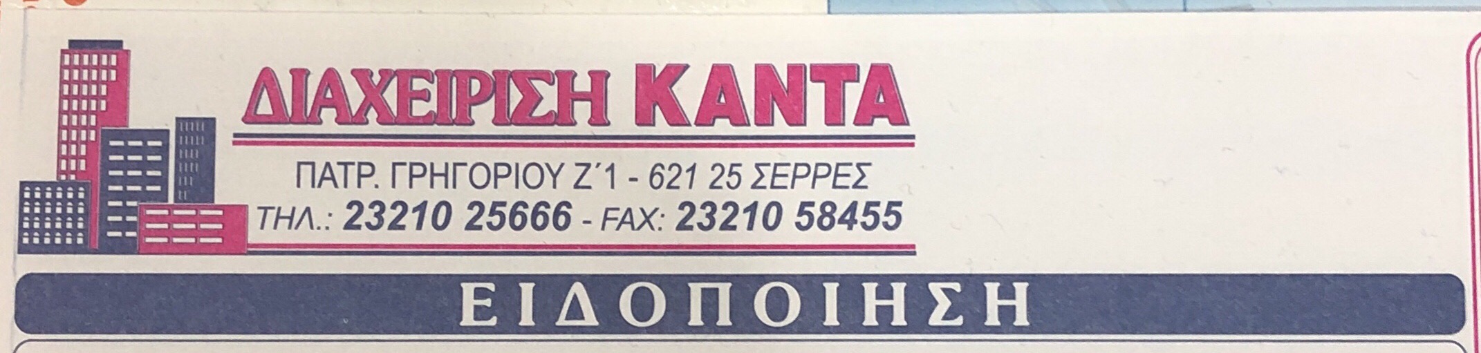 ΔΙΑΧΕΙΡΙΣΗ ΚΑΝΤΑ Ο.Ε. - ΕΚΔΟΣΗ - ΔΙΑΧΕΙΡΙΣΗ ΚΟΙΝΟΧΡΗΣΤΩΝ -ΔΙΑΧΕΙΡΗΣΗ ΚΤΙΡΙΩΝ - ΠΟΛΥΚΑΤΟΙΚΙΩΝ ΣΕΡΡΕΣ
