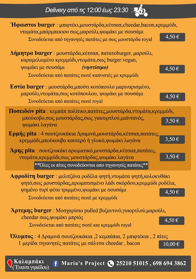 ΕΣΤΙΑΤΟΡΙΟ ΚΑΛΑΜΠΑΚΙ ΔΡΑΜΑΣ , ΜΑΓΕΙΡΕΥΤΑ ΦΑΓΗΤΑ , ΨΗΤΑ ΤΗΣ ΩΡΑΣ, ΠΙΤΣΑ, BURGER , ΦΑΓΗΤΟ ΣΕ ΠΑΚΕΤΟ.
