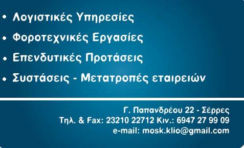 ΜΟΣΚΟΦΙΔΟΥ ΚΛΕΙΩ ΚΑΙ ΣΥΝΕΡΓΑΤΕΣ - ΛΟΓΙΣΤΙΚΟ -ΦΟΡΟΤΕΧΝΙΚΟ ΓΡΑΦΕΙΟ-ΣΕΡΡΕΣ