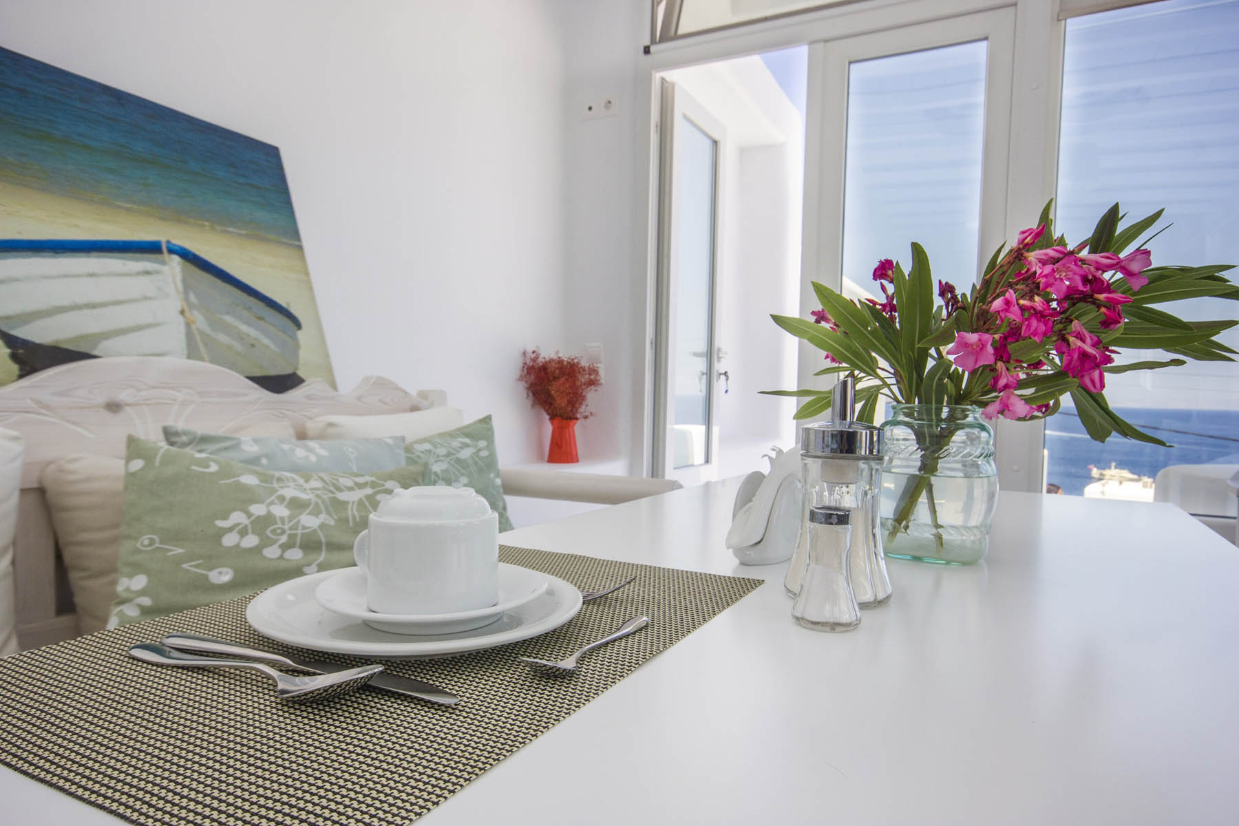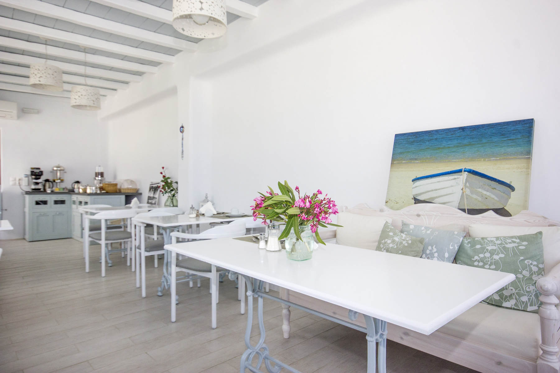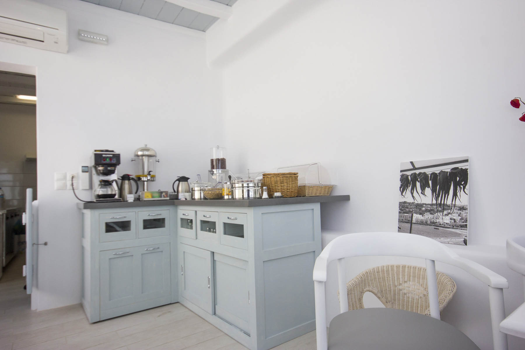 Современный зал для завтраков и терраса - идеальное место для отдыха, где можно наблюдать за бесконечной синевой Эгейского моря и соседнего острова Киклад. Терраса - идеальное место для наслаждения ежедневным завтраком или вечерним напитком, созерцая эту уникальную природную греческую красоту в моменты абсолютного расслабления.