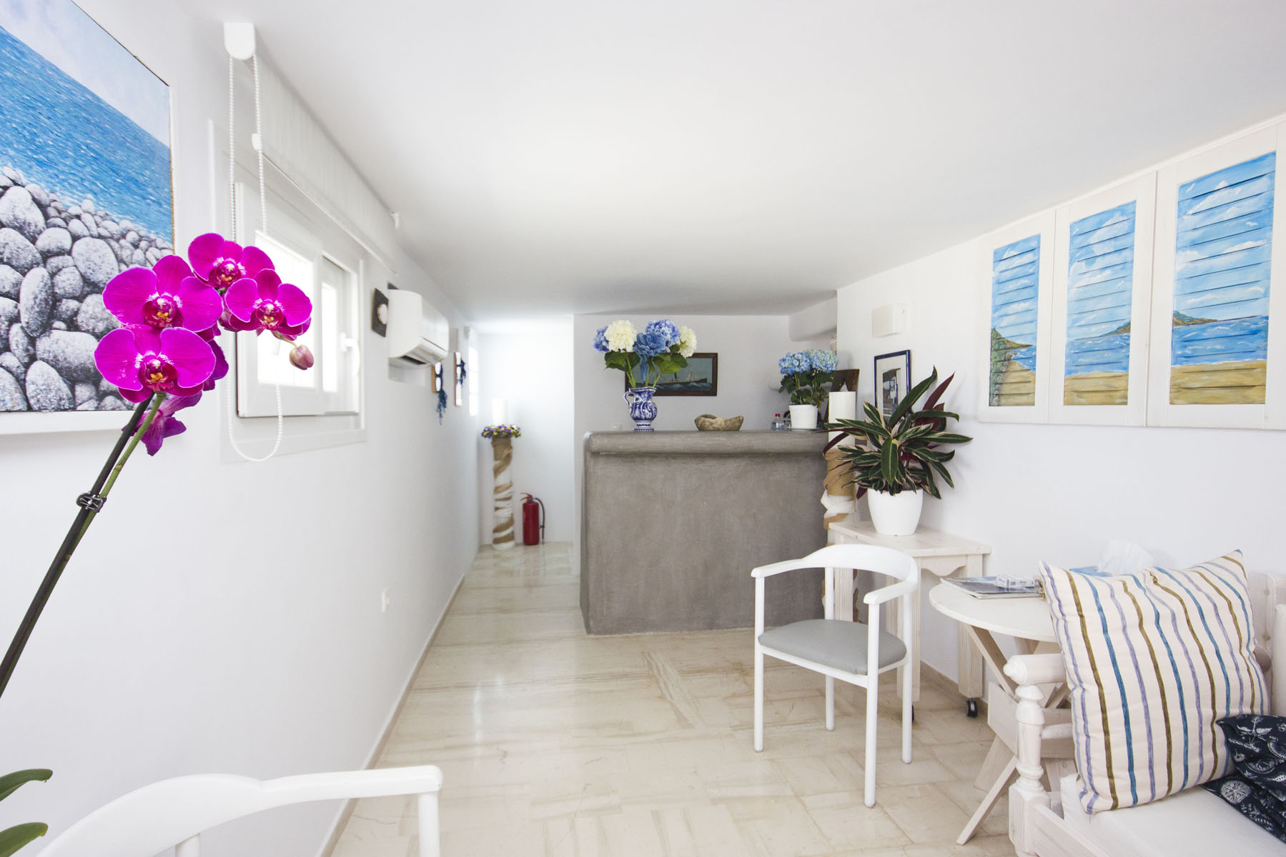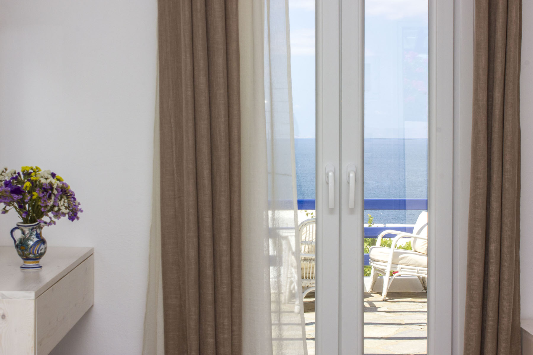 The modern breakfast hall and terrance area, is the ideal spot for relaxing, while observing the endless blue of the Aegean Sea and the adjacent Cycladian Island. The terrace is the perfect spot for enjoying your daily breakfast or drink during the evening, while gazing at this unique natural Greek beauty in moments of absolute relaxation.