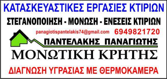 ΠΑΝΤΕΛΑΚΗΣ ΠΑΝΑΓΙΩΤΗΣ - ΜΟΝΩΤΙΚΗ ΚΡΗΤΗΣ, ΜΟΝΩΤΙΚΗ ΚΡΗΤΗΣ, ΚΑΤΑΣΚΕΥΑΣΤΙΚΕΣ ΕΡΓΑΣΙΕΣ ΚΤΙΡΙΩΝ - ΔΙΑΓΝΩΣΗ ΥΓΡΑΣΙΑΣ ΜΕ ΘΕΡΜΟΚΑΜΕΡΑ, αποξηλώσεις, τσιμεντοκονίες, χτισίματα - επιχρίσματα, τοποθέτηση πλακιδίων, εφαρμογή γυψοσανίδων, υδραυλικές εργασίες, σιδηρές κατασκευές, ΧΑΝΙΑ